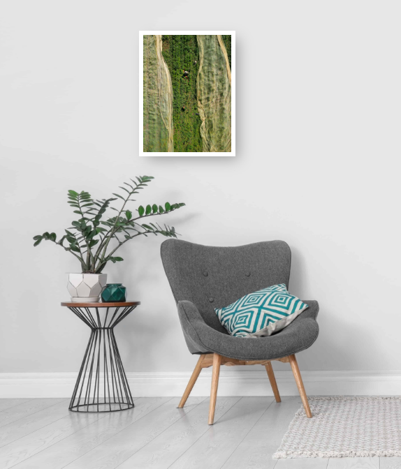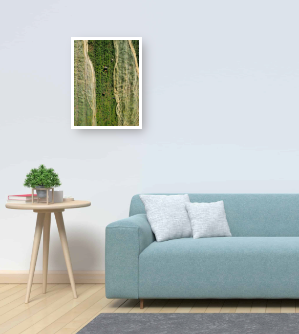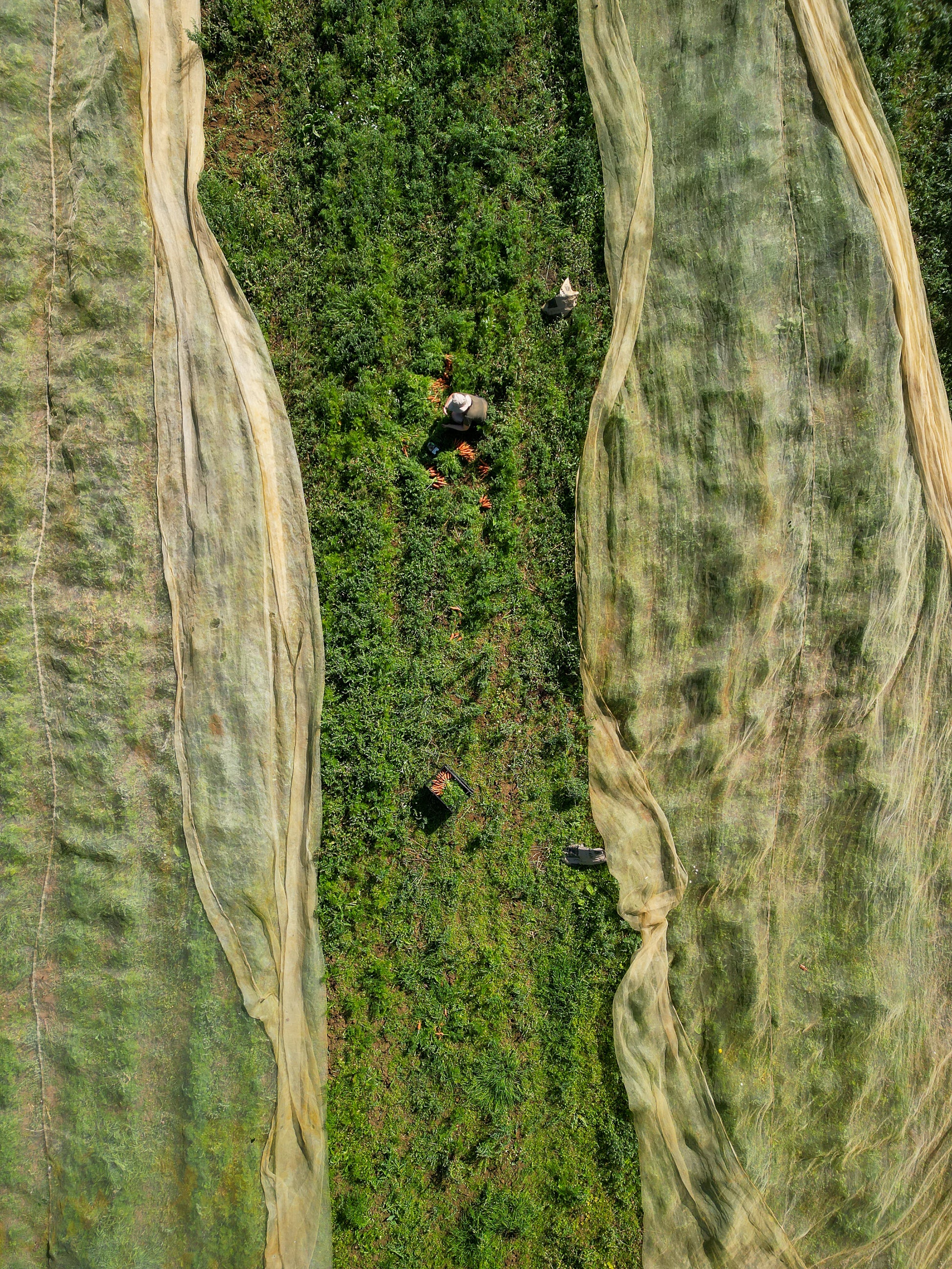Seen from above, the harvest becomes a beautiful pattern of green rows and flowing fabric covers. A lone worker gathers crops by hand, adding scale and life to the landscape. A peaceful, grounded moment from the rhythm of rural work.