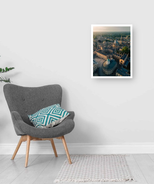 Experience the quiet magic of Oxford from above with this beautifully crafted aerial photograph, captured in the soft early-morning light. The iconic Radcliffe Camera glows warmly at the centre of the scene, surrounded by the intricate rooftops, spires, and courtyards that define the city’s historic heart.