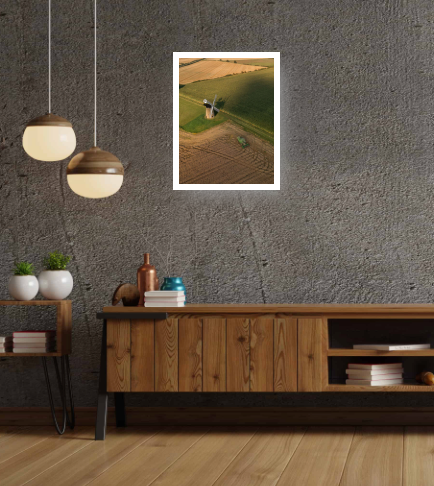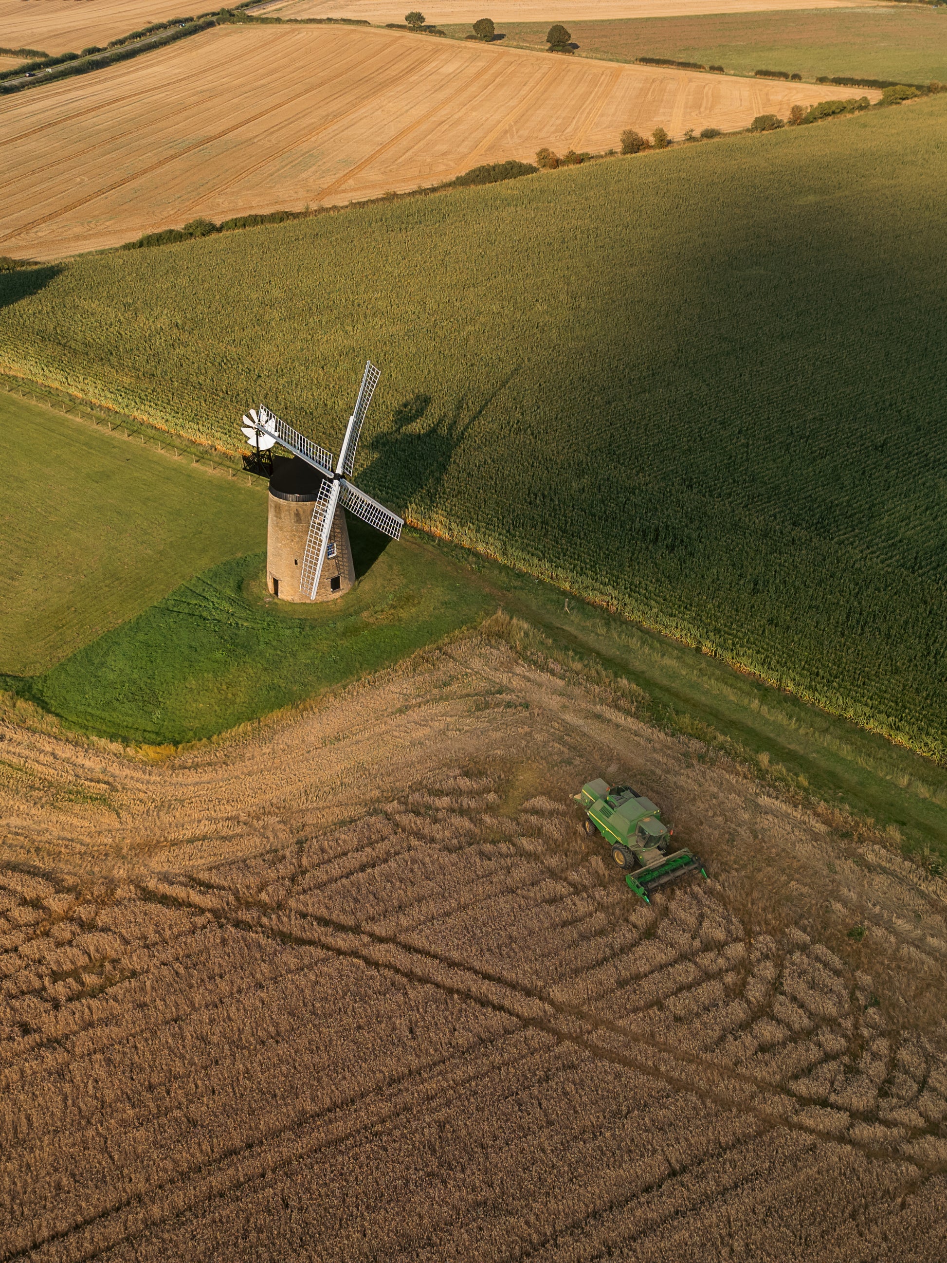 A stunning aerial photograph capturing a historic windmill surrounded by golden fields at harvest time. Warm evening light casts long shadows across the landscape, highlighting the textures of cropped farmland and the presence of a working combine harvester. A peaceful and detailed countryside scene full of character.