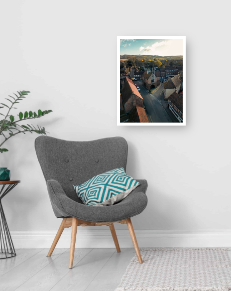 A charming aerial view of Whatlington, capturing its historic brick buildings, winding roads and warm evening light. A peaceful village scene filled with texture, character and rural English charm.