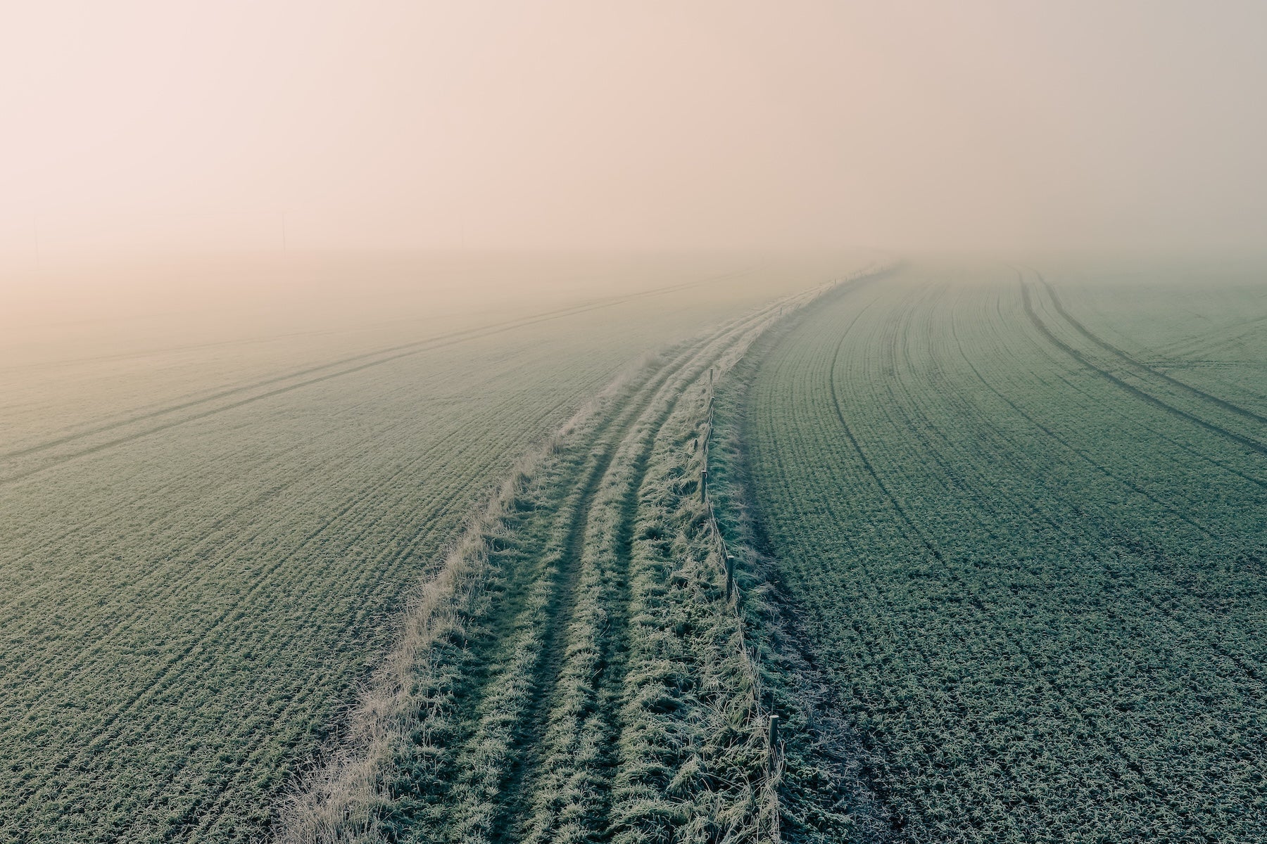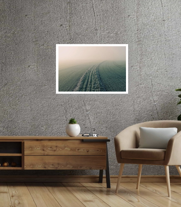 Step into the stillness of a winter morning with Into the Mist, a calming aerial photograph that captures frost-softened fields disappearing into a quiet haze. The gentle curve of tractor lines leads the eye toward the horizon, where the landscape melts seamlessly into pale dawn light.