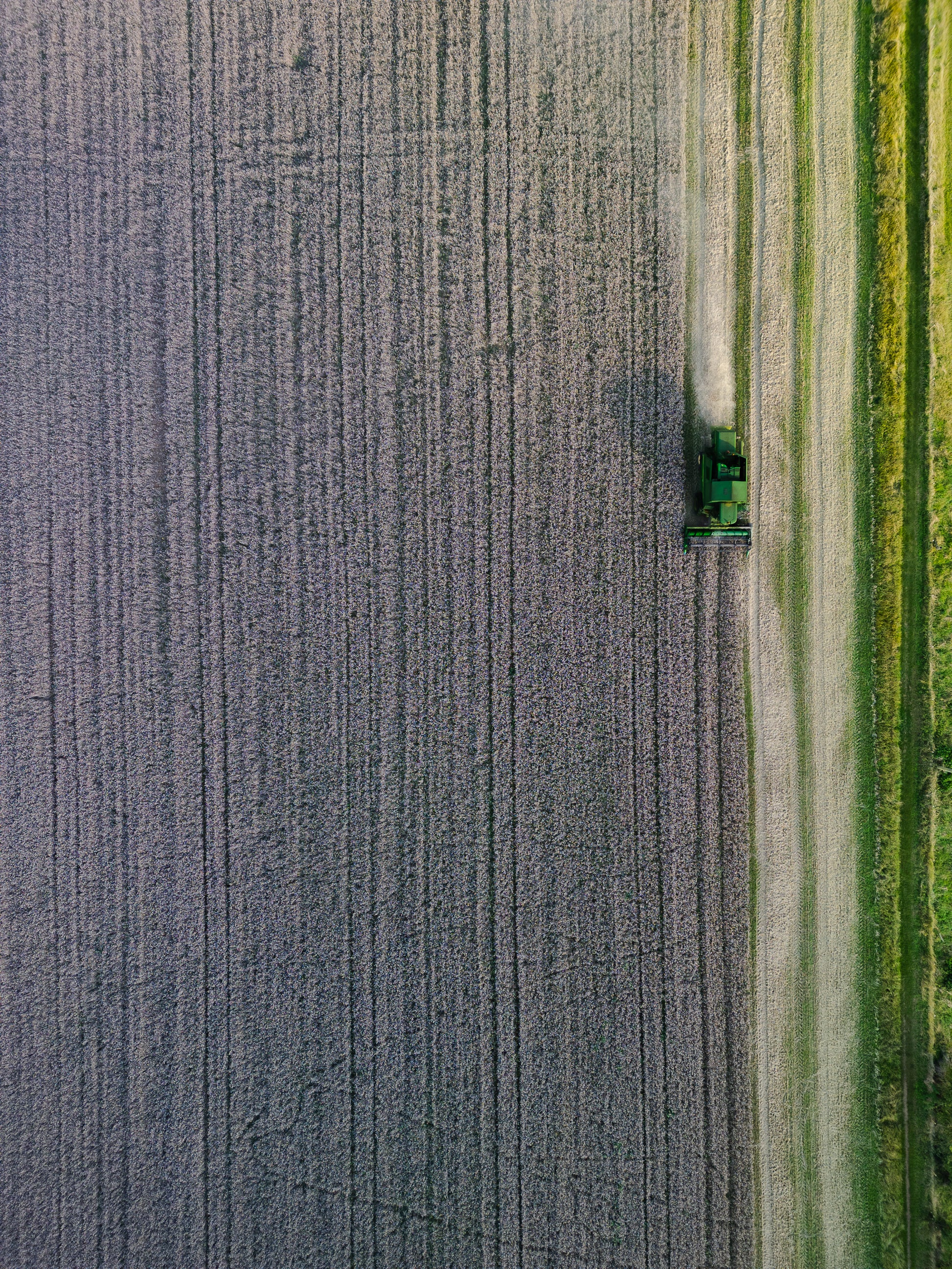 Captured from high above, this compelling aerial photograph transforms a working harvest into a piece of natural abstract art. Perfect rows stretch across the frame like pencil marks on a canvas, while a lone green harvester moves with purposeful calm, leaving soft trails of dust and freshly cut earth in its wake.