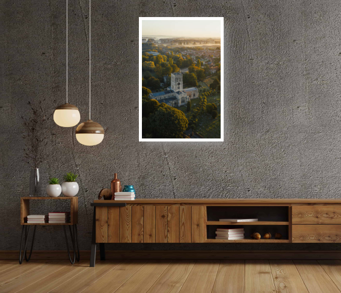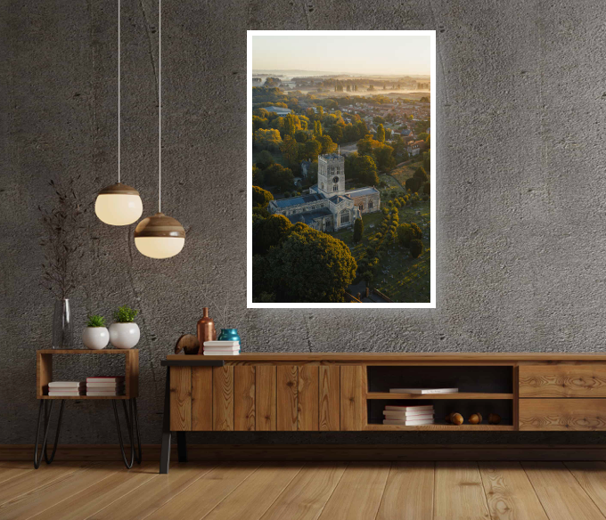 Bring a sense of calm and timeless beauty into your home with this stunning aerial photograph of St Mary’s Church in Thame, bathed in golden sunrise light. Captured from above, the scene reveals exquisite detail — the texture of ancient stone, long shadows stretching across the churchyard, and soft morning mist drifting over the surrounding Oxfordshire countryside.