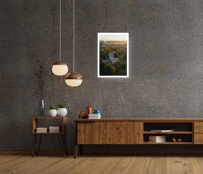 Warm autumn tones and gentle early-morning atmosphere make this piece a perfect focal point for living rooms, bedrooms, hallways or workspaces. Printed on premium fine-art paper and available framed to gallery standards, this artwork blends historic architecture with the tranquillity of the rural landscape.
