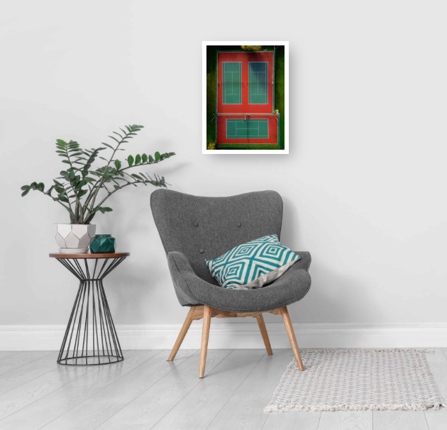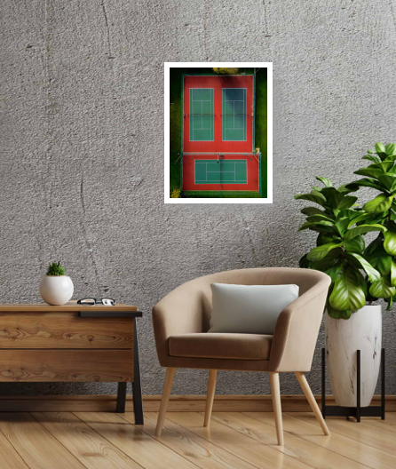A striking aerial photograph capturing a set of vibrant red-and-green tennis courts from directly above. The geometric symmetry, crisp court lines, and bold colour contrast create a compelling, modern composition—perfect for sports enthusiasts and lovers of contemporary graphic art.