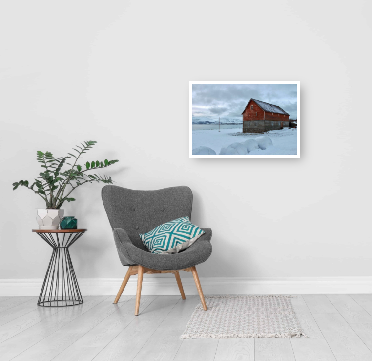 A lone red barn sits quietly in a sweeping winter landscape, framed by still water and snow-covered mountains. Soft, cold light washes over the scene, capturing the quiet beauty and isolation of the Nordic countryside.