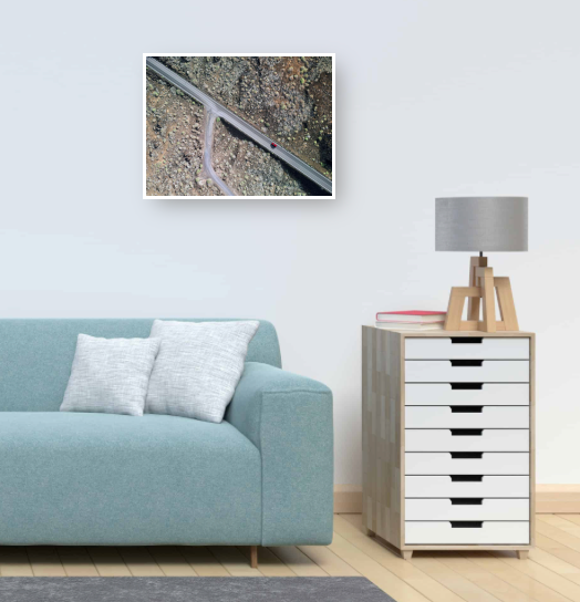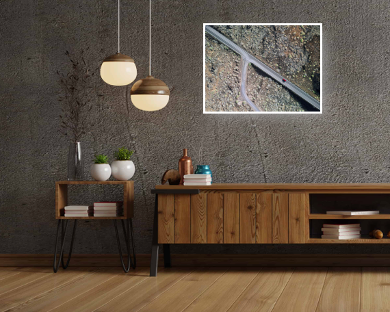 A striking aerial photograph of a lone red car travelling along an isolated road cutting through rugged terrain. The straight line of the tarmac contrasts beautifully with the textured landscape, creating a bold, minimalist composition full of clarity and detail.